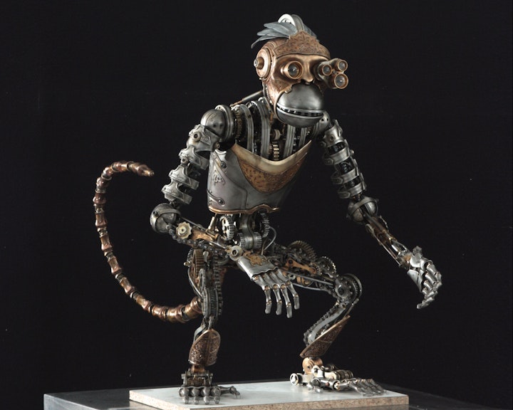 Posable robot monkey model of 3D printed, lasercut and CNC machined parts with crank and projector in the head for "Emerald City"