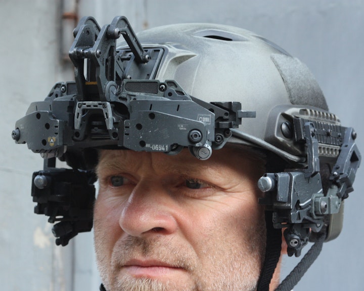 One of the 22 sets of helmets and backpacks with remotely controllable LED lights and ventilation system via dmx and wifi for "Mars 2"