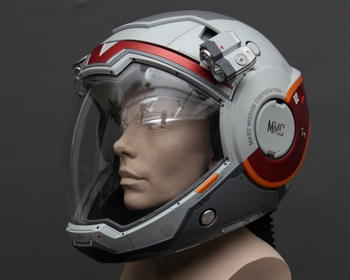 One of the 22 helmets with remotely controllable LED lights and ventilation system via dmx and wifi for "Mars"