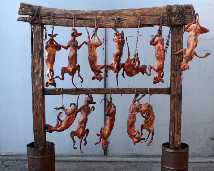 Latex and polyfoam fried cats on a real wood stall for the Troll Market in "Hellboy 2".