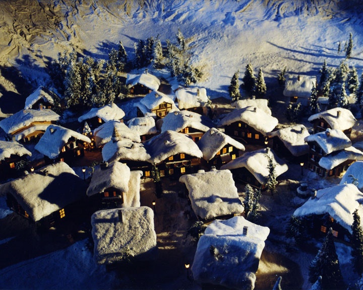 4 meter miniature of a swiss village with internal lights and christmas decorations for a "Cailler" TV commercial.