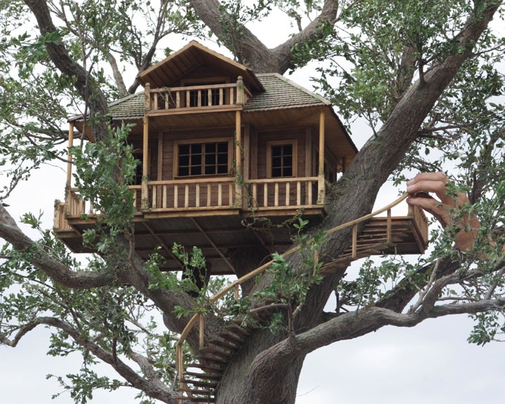 Minature wooden model of a treehouse with a custom-built tree model for a "Ferrero Rocher" commercial.