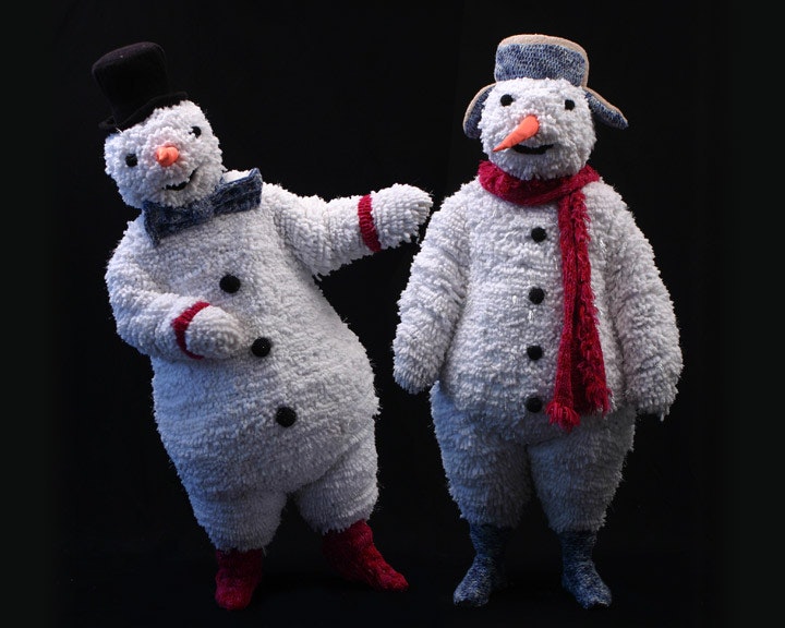 Human sized snowman and snowwoman christmas ornament costume for "The Nutcracker".